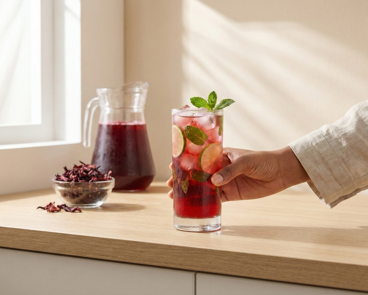 Naturally dried hibiscus flowers from Ghana. A vibrant, tangy, antioxidant-rich addition to teas, cold infusions, and daily hydration routines.