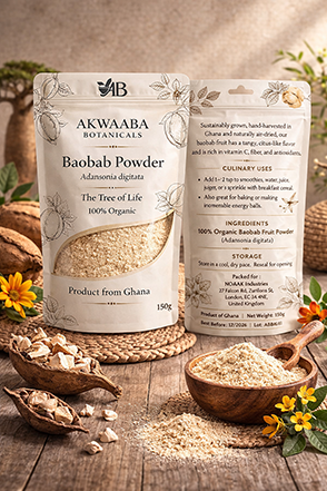 Naturally dried baobab fruit from Ghana. A tangy nutrient rich superfood powder perfect for smoothies, drinks, and energy wellness routines.